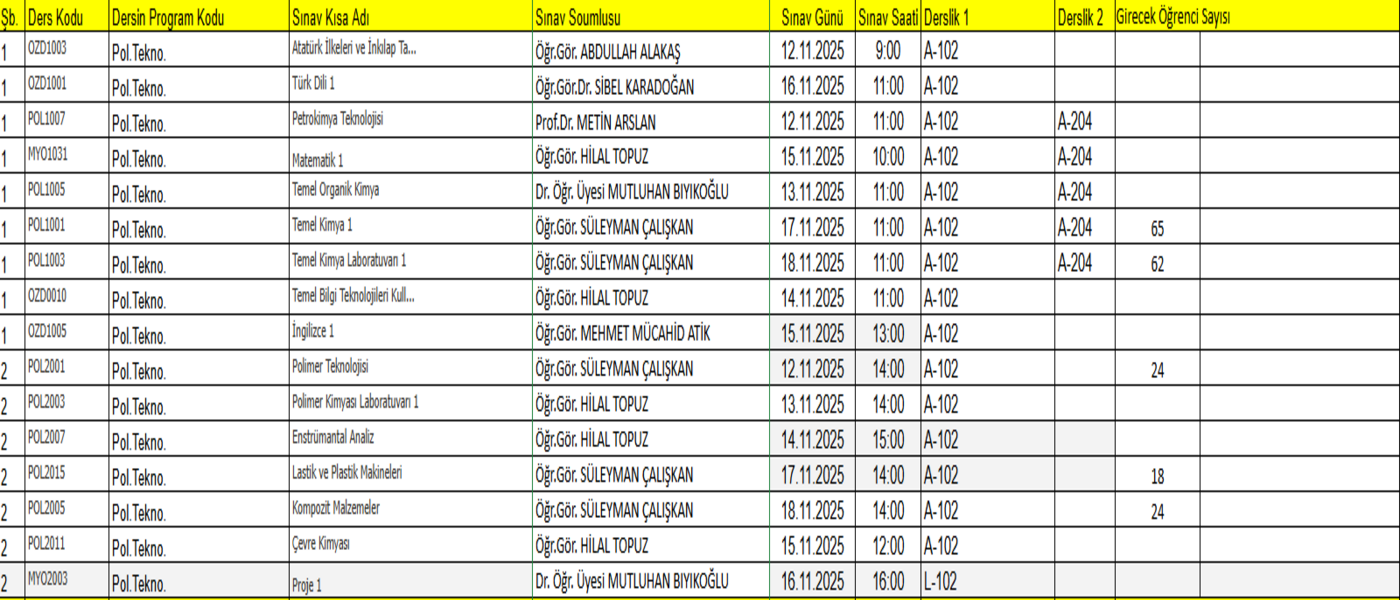 Polimer Teknolojisi Programı 2025-2026 Güz Dönemi Vize Sınav Programı